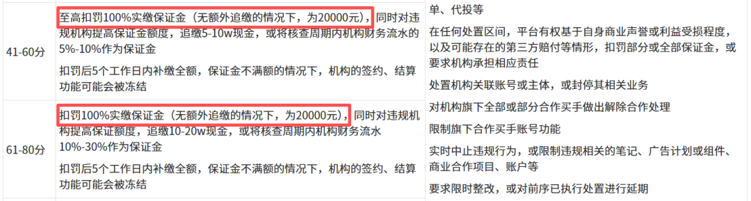 此次公告中,有11家机构被限制代博主接单权限30天-90天。这应是因为触犯了新规中“1-40分”的初级风控阈值。即在整改完成或补缴保证金之前,暂停机构的结算、蒲公英接单、代投等权限。