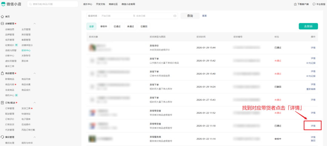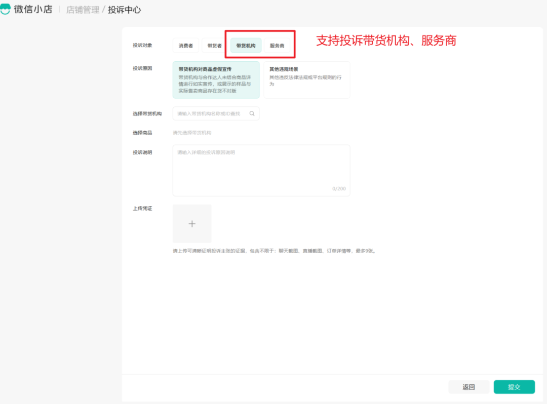从投诉步骤来看,商家只需进入微信小店后台的“店铺管理-投诉中心”,点击“去投诉”按钮,即可在投诉对象选项中找到“带货机构”与“服务商”。