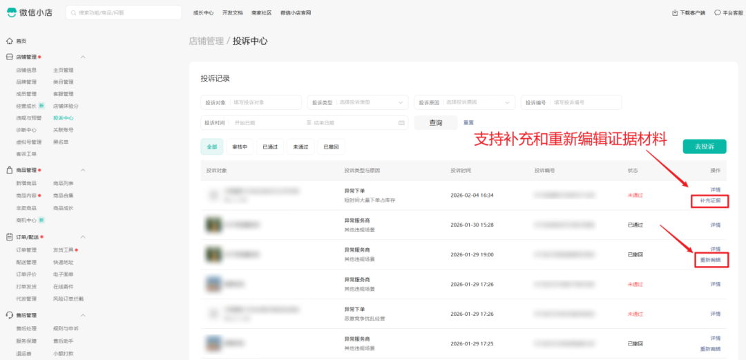 并且,针对以往商家反馈的“证据提交后无法修改”痛点,增加了“补充证据”和“重新编辑”功能。