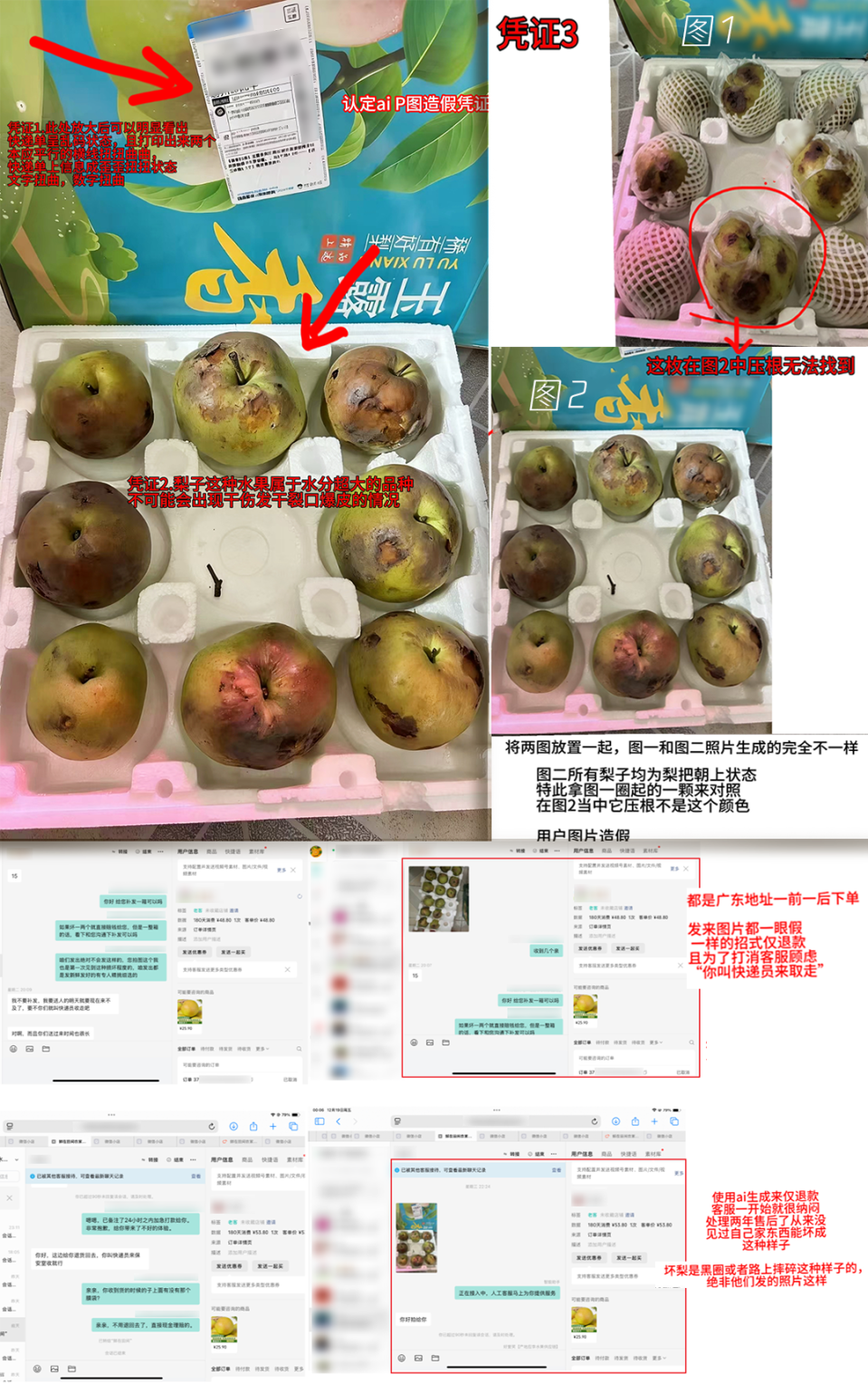 技术型造假骗取退款:用户利用AI生图等技术手段,虚构商品破损、质量差等假证据,骗取售后补偿。