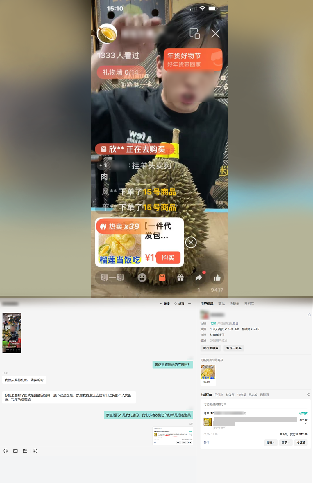 视觉误导:卖的是“榴莲泡芙”,直播中却全程展示“新鲜生榴莲”,误导用户以为买到的是生鲜。