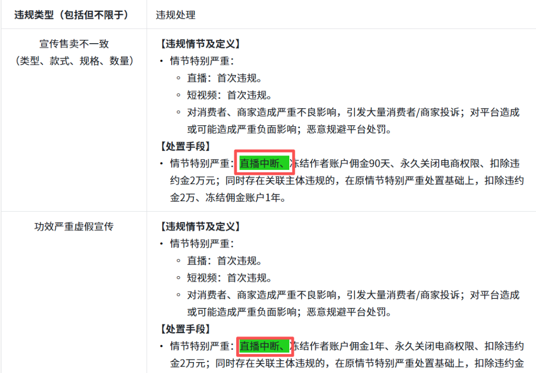 这一变化,主要源于《创作者【严重虚假宣传】实施细则》修订中两项关键条款的叠加与拉齐:平台在“宣传售卖不一致”、“功效严重虚假宣传”等违规类型的“情节特别严重”处置措施中,明确增加了“直播中断”这一处罚。