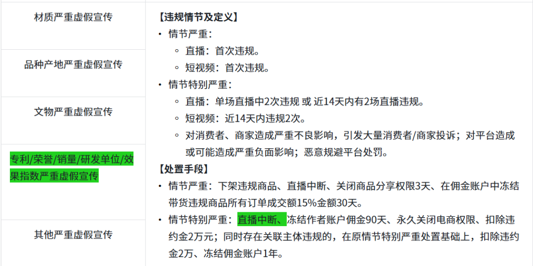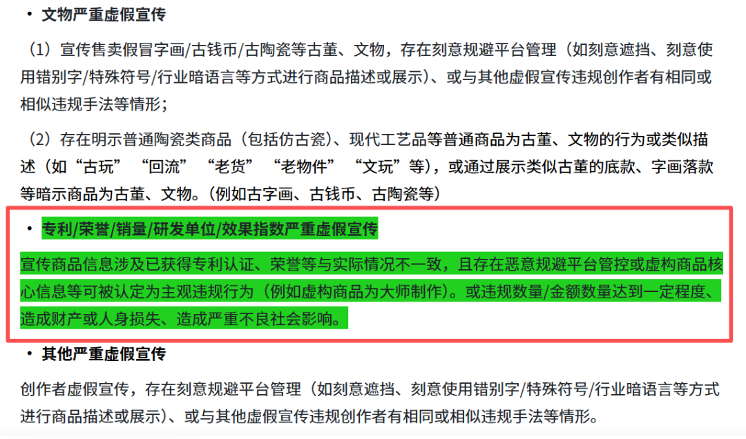 条款明确界定,若创作者宣传的商品涉及已获得专利认证、荣誉等与实际情况不一致,且存在虚构商品核心信息(如虚构商品为大师制作)等主观违规行为,其处罚将与“其他严重虚假宣传”保持一致。