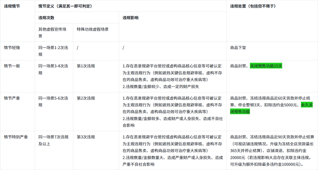 首先说预售限制,若商家在同一场景下发生3-4次违规(即情节一般)时,在商品封禁的基础上,将新增“关闭预售功能15天”的处罚;