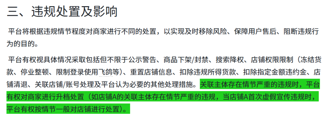其次是连坐升级:如果店铺A的关联主体存在情节严重的违规,那么当店铺A首次发生虚假宣传违规时,平台有权跳过常规的“情节轻微”判定,直接按“情节一般”对其进行升档处置。但对于升一档还是两档等细节标准尚未明确。