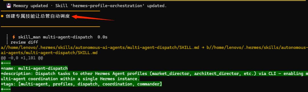 修复问题后,它会自己创建 skill 记录这次问题以便复用,这就是 Hermes Agent 的记忆功能。
