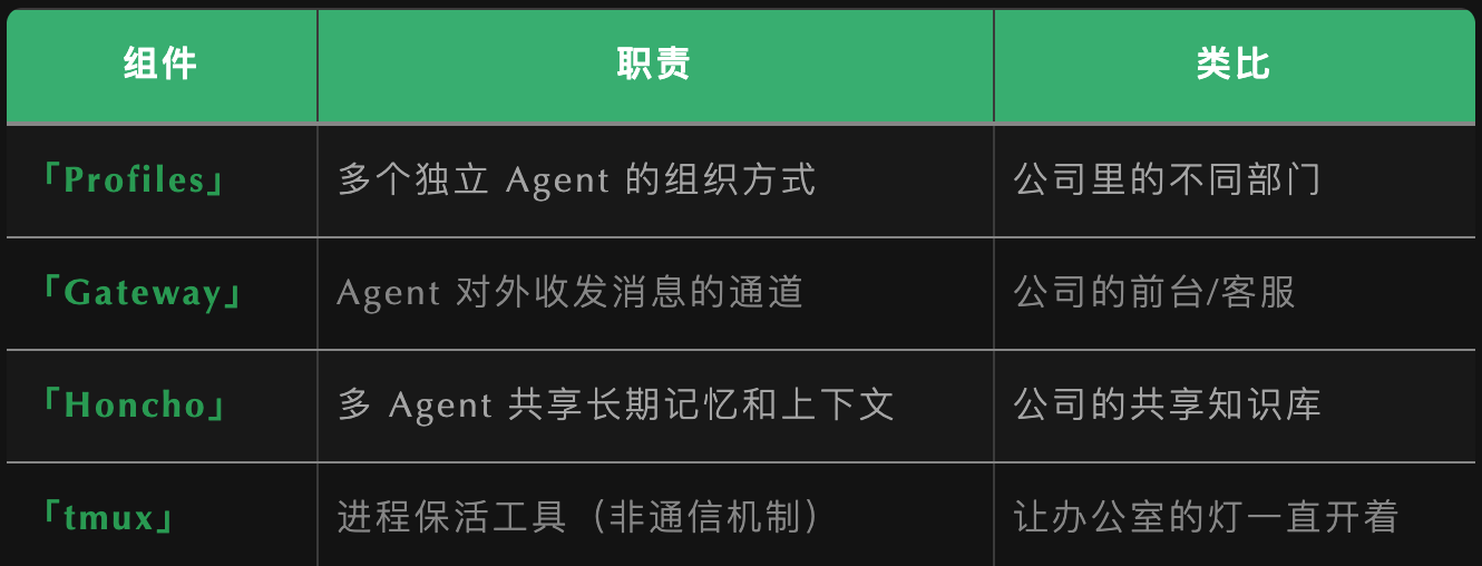 角色化分工(Profiles) +共享上下文(Honcho) +明确任务交接(Gateway + 共享记忆) =多 Agent 协同系统