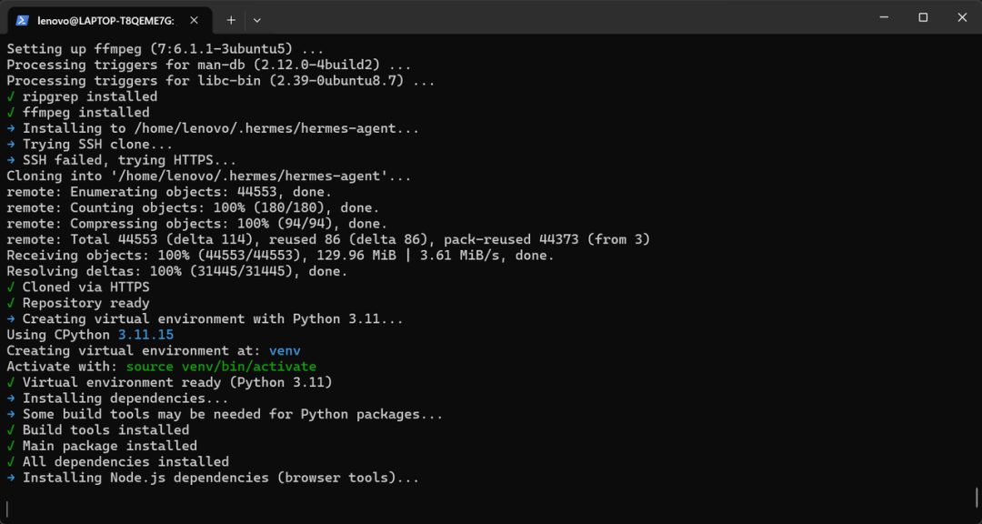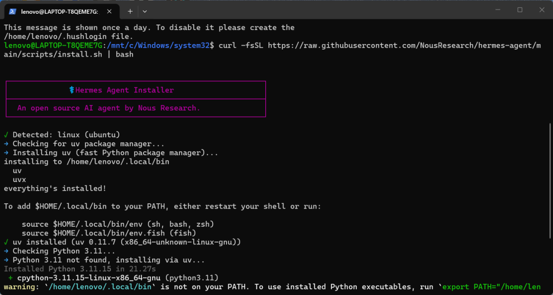 脚本会自动安装:Python、Node.js、代码仓库、虚拟环境、全局 hermes 命令。