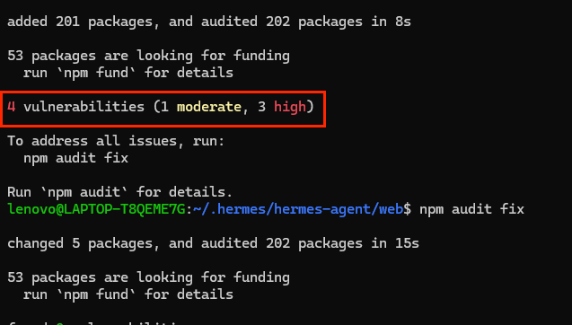 如果提示有安全漏洞,跑一次 npm audit fix 修补。