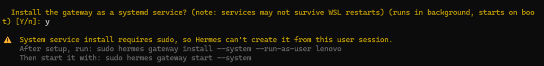 gateway install –system –run-as-user lenovosudo <这里替换成 which hermes 输出的完整路径>