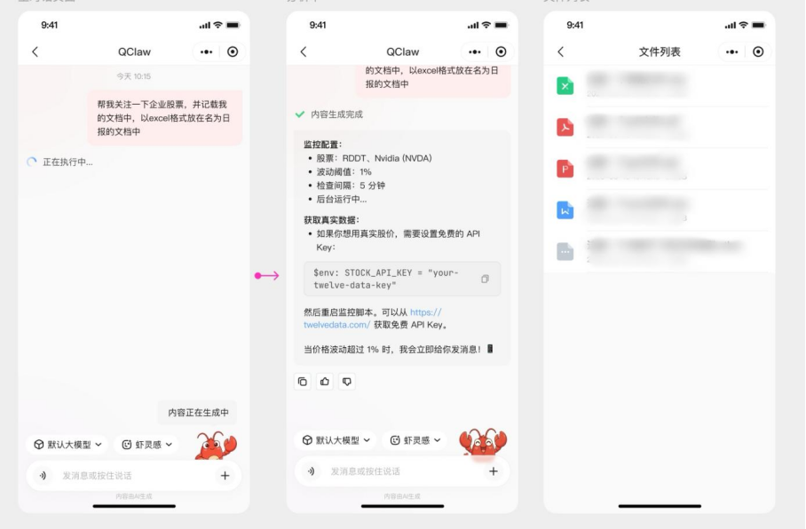 新版本的变化在于,上线了小程序文件传输能力。用户仍然可以通过客服号给自己的“龙虾”派活,但在电脑端处理完文件后,QClaw现在可以直接把文件发送到微信小程序。