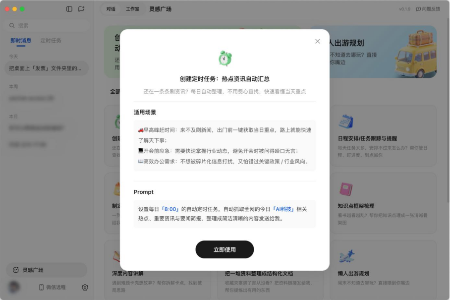 QClaw这次上线的“灵感广场”预置了常用Skills,围绕办公提效、深度研究、娱乐游戏、自律生活等典型场景,打造了近20个常用任务。用户无需自己配置或编写复杂指令,只要点击“立即使用”,就能运行对应Skills。