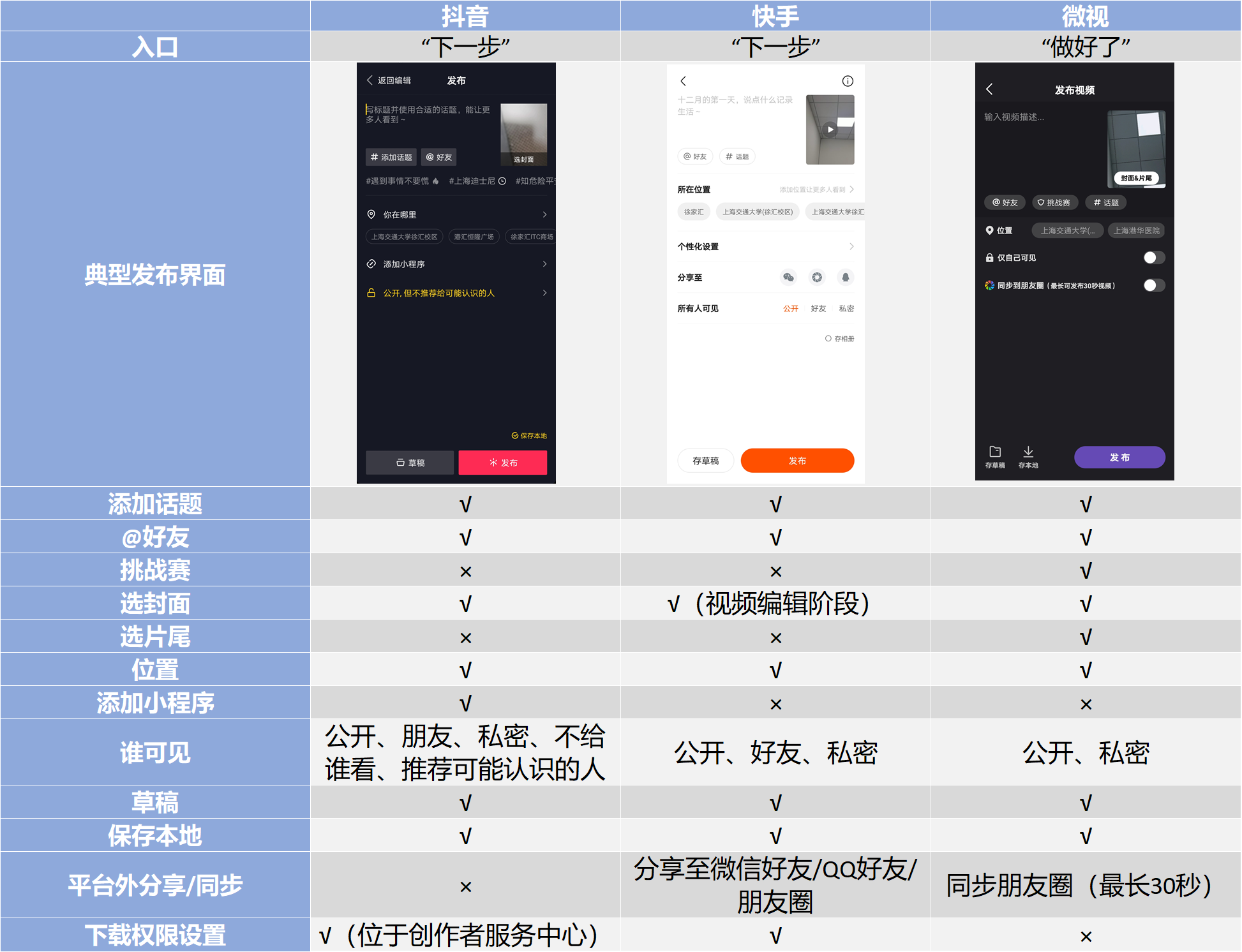 三款App都提供了话题添加、@好友、位置等基本功能,即使该模块下没有的功能也能在其他模块找到,比如快手的封面在视频编辑模块,抖音的下载权限设置在创作者服务中心模块等等。